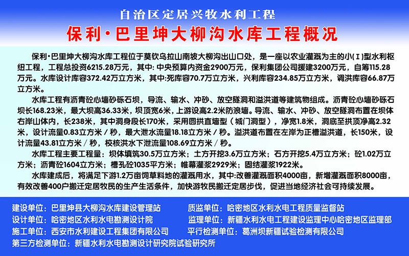 大柳溝水庫位于新疆維吾爾自治區(qū)巴里坤縣莫欽烏拉山南坡,距哈密市154km。地理位置東經(jīng)93°35.5'-38',北緯43°35'-37'。水庫距巴里坤縣54.0km,有鄉(xiāng)村公路相通,交通比較便利。工程屬攔河式水庫。承擔下游灌溉、人畜用水的任務(wù),同時兼防洪功能,水庫控制灌溉面積1.2萬畝。水庫總庫容372.42萬m3,最大壩高36.33m,壩頂長168.23m。樞紐工程由攔河壩,導(dǎo)流放水洞,溢洪道等建筑物組成。工程規(guī)模屬?。?)型。